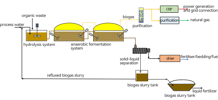 - In response to different materials and customer needs, we flexibly customize professional system solutions. We provide full-process services covering raw material collection, transportation and storage, engineering design and construction, biogas slurry and residue treatment and disposal, biogas energy production, etc.